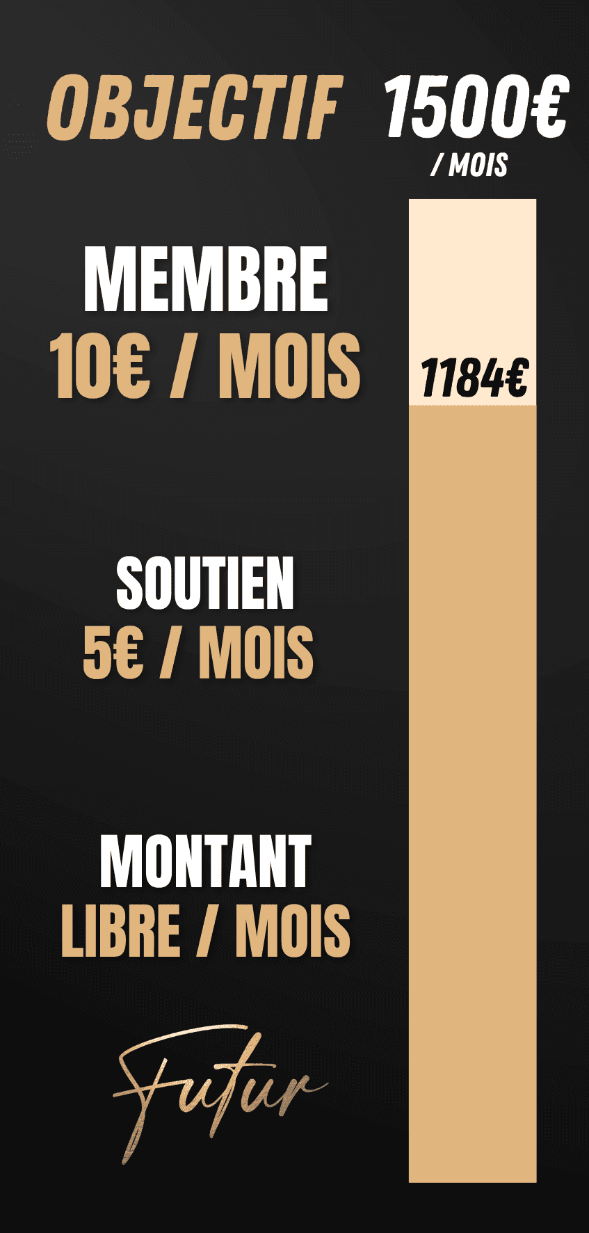 Pour mieux comprendre l’impact de votre soutien, vous trouverez ici des visuels qui présentent les objectifs de FUTUR pour 2026 et le coût de chacune de nos campagnes en 2025.