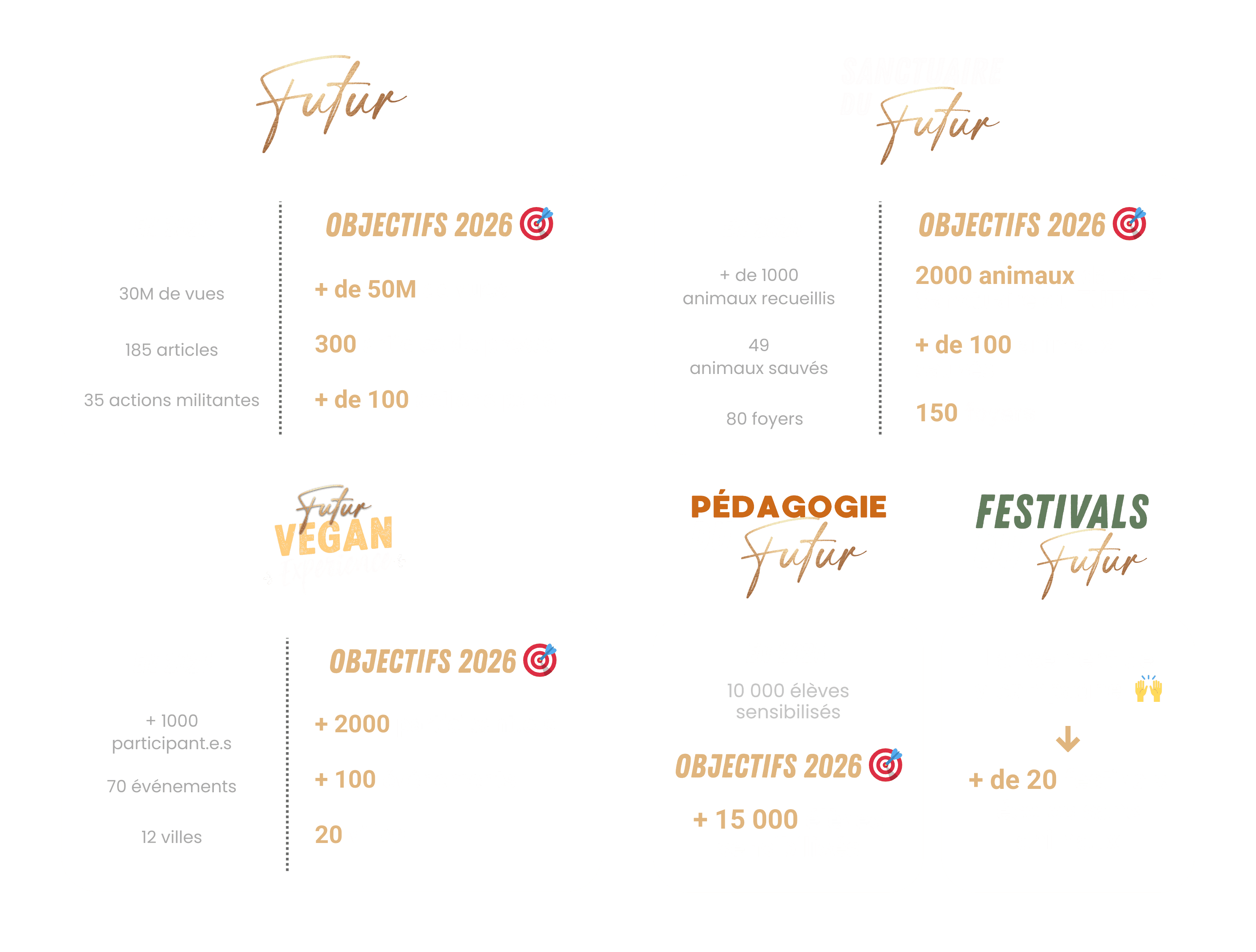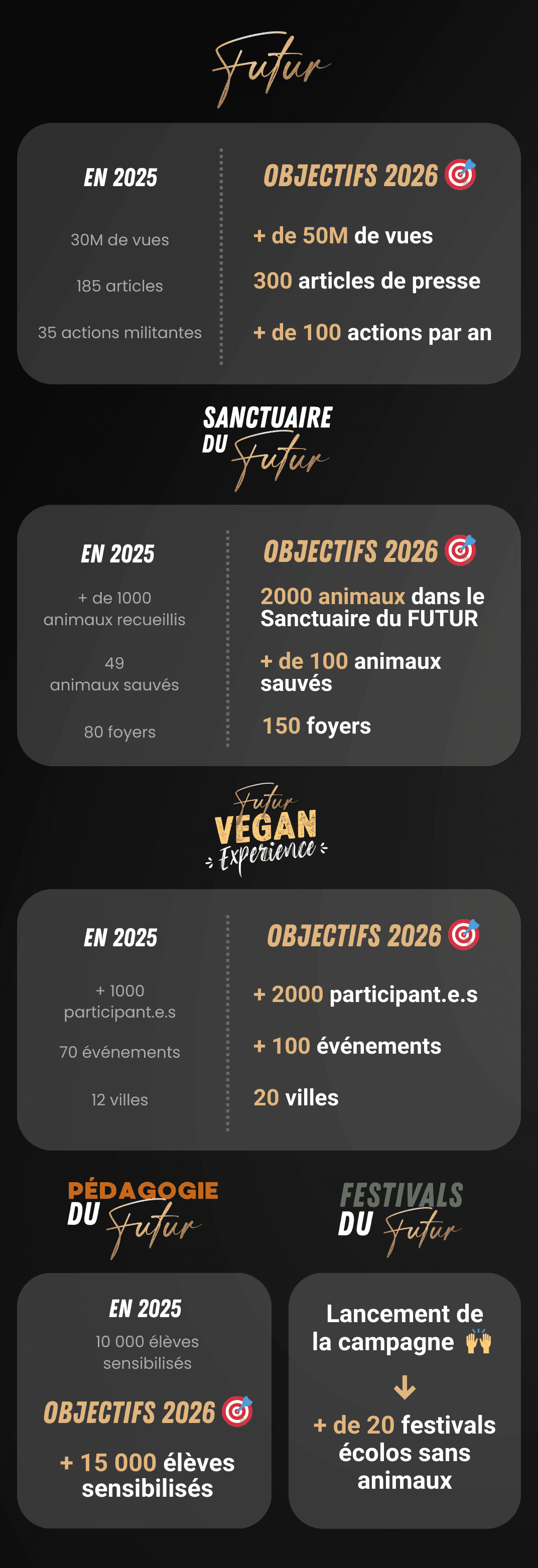 Pour mieux comprendre l’impact de votre soutien, vous trouverez ici des visuels qui présentent les objectifs de FUTUR pour 2026 et le coût de chacune de nos campagnes en 2025.