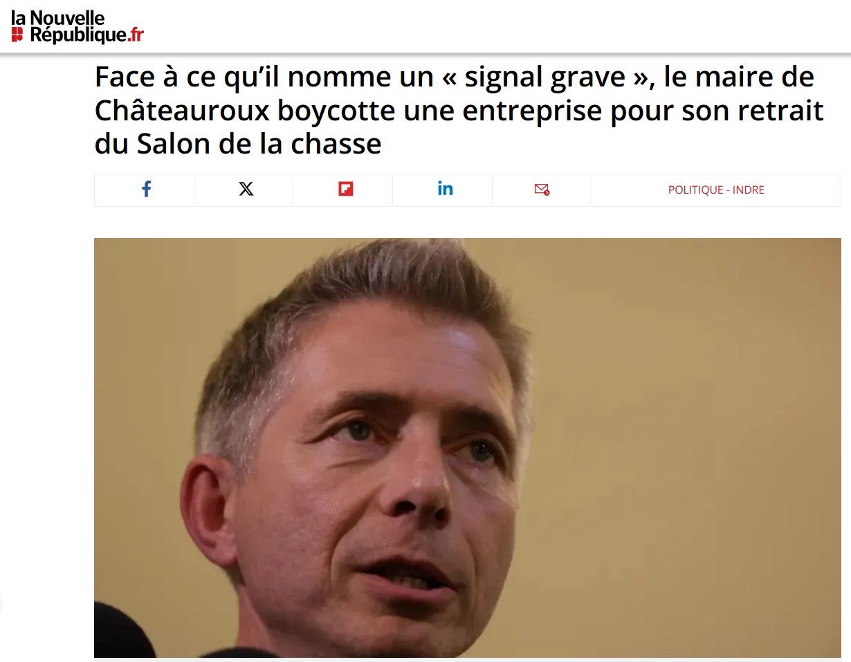 En mars 2026, l’association FUTUR a interpellé les sponsors du Salon de la chasse, dénonçant leur soutien à un événement qu’elle associe à la promotion de pratiques controversées, comme la chasse au trophée à l’étranger, le déterrage ou encore le piégeage. Dans la foulée, l’entreprise Lyreco a annoncé son retrait du sponsoring du salon. Une décision saluée comme une victoire par FUTUR, mais vivement critiquée par le maire de Châteauroux, qui y voit au contraire un « signal grave ».