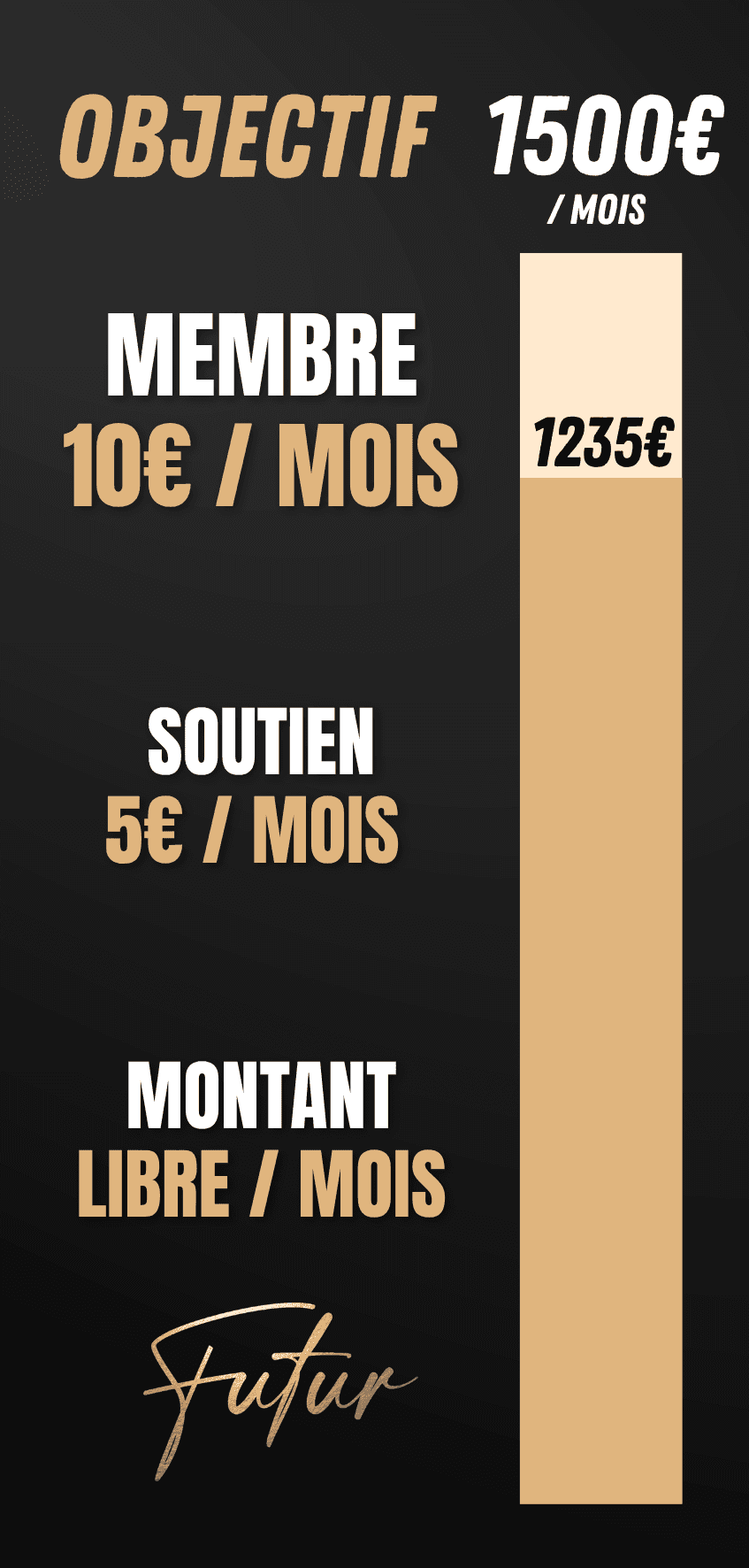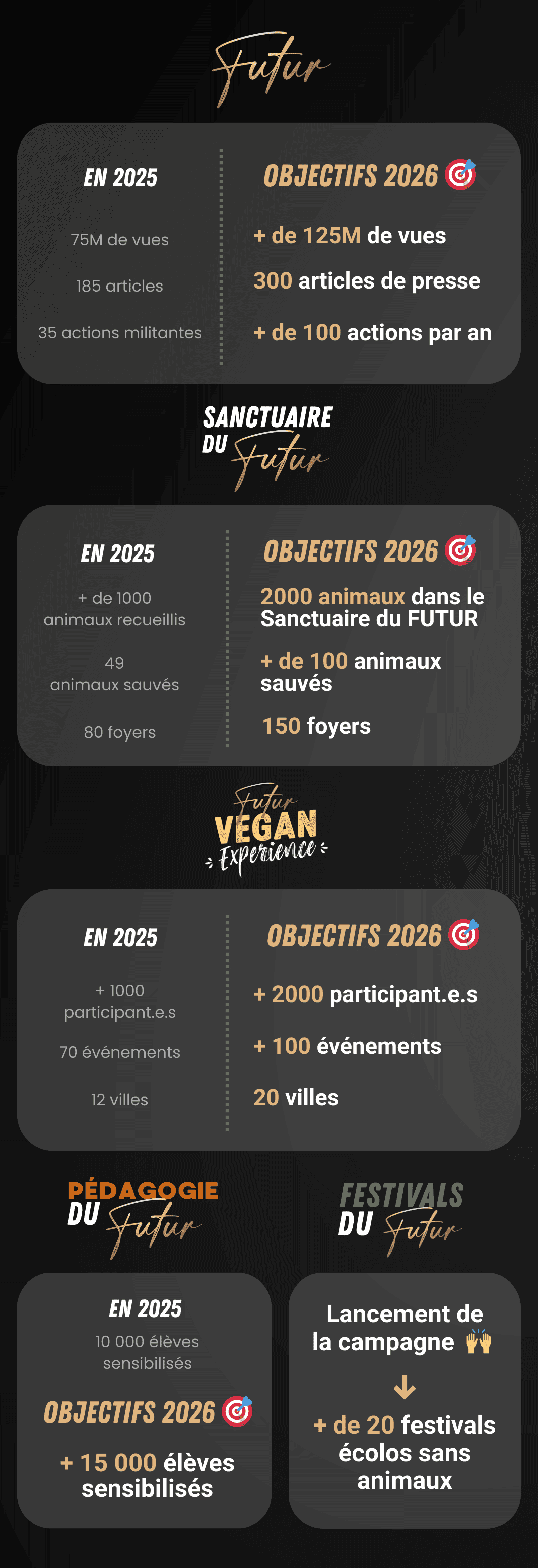 Pour mieux comprendre l’impact de votre soutien, vous trouverez ici des visuels qui présentent les objectifs de FUTUR pour 2026 et le coût de chacune de nos campagnes en 2025.